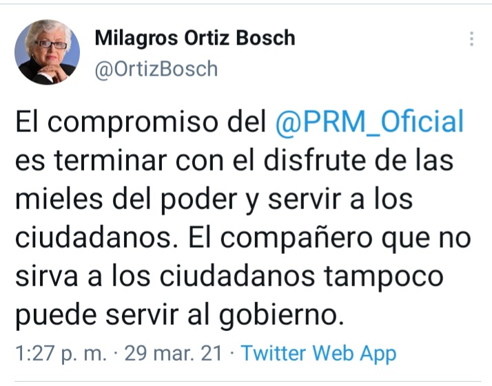 “Me veo en la obligación de transmitir este mensaje a la provincia de Montecristi, al poder no se va a disfrutar de las mieles del poder, al poder se va a servir y el perremestia que no esté dispuesto a servirle al Estado tiene que saber que no puede servirle a este Gobierno, hay conceptos importantes que corregir y corregir este concepto es la obligación que éticamente me corresponde”, advirtió Ortiz Bosch durante una visita al Palacio Nacional.